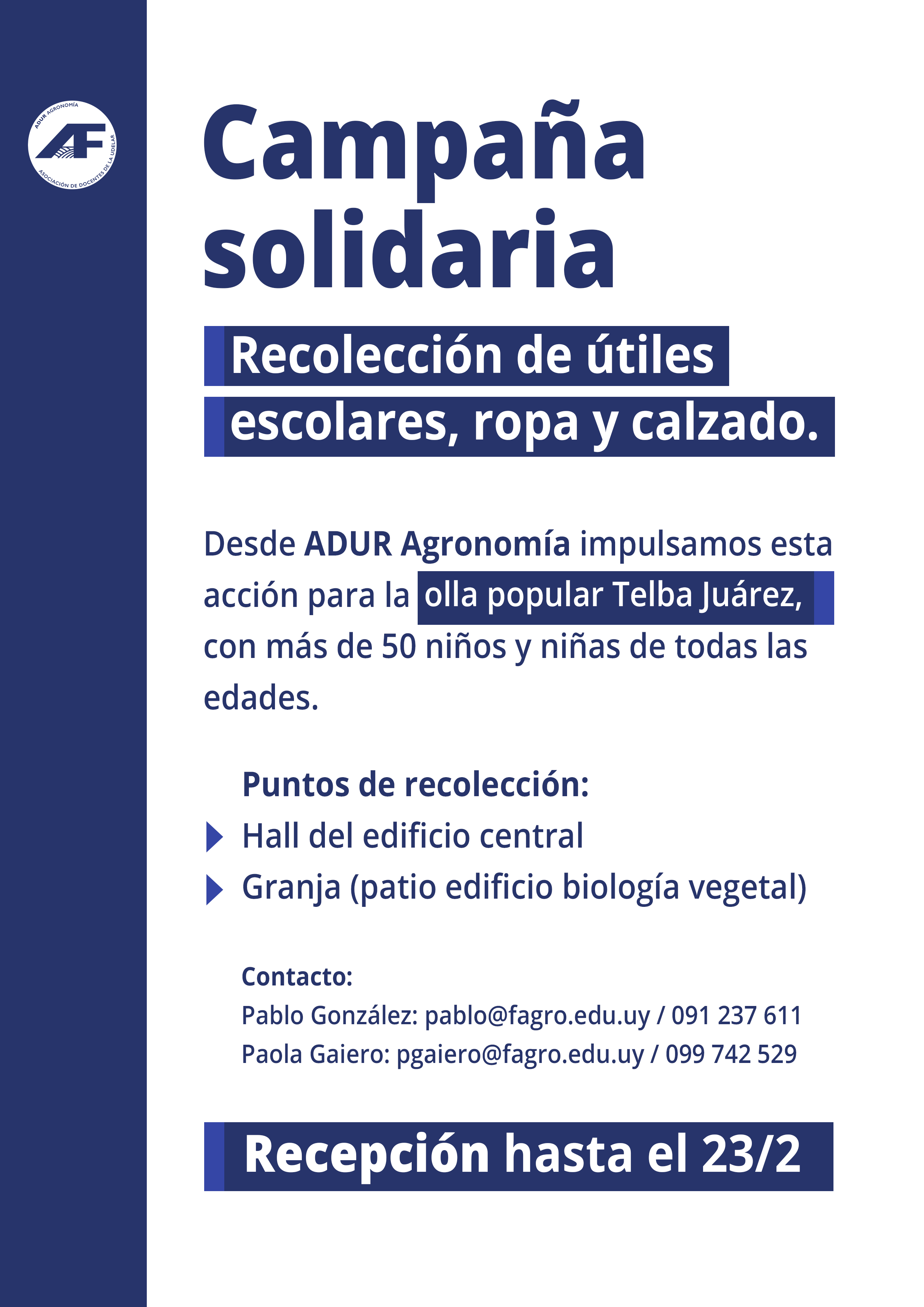 Desde ADUR Agronomía impulsamos una campaña de recolección de útiles escolares, ropa y calzado en buen estado, destinados a niños y niñas (también adultos y adultas), con el objetivo de colaborar con vecinos y vecinas que asisten a la olla popular Telba Juárez.