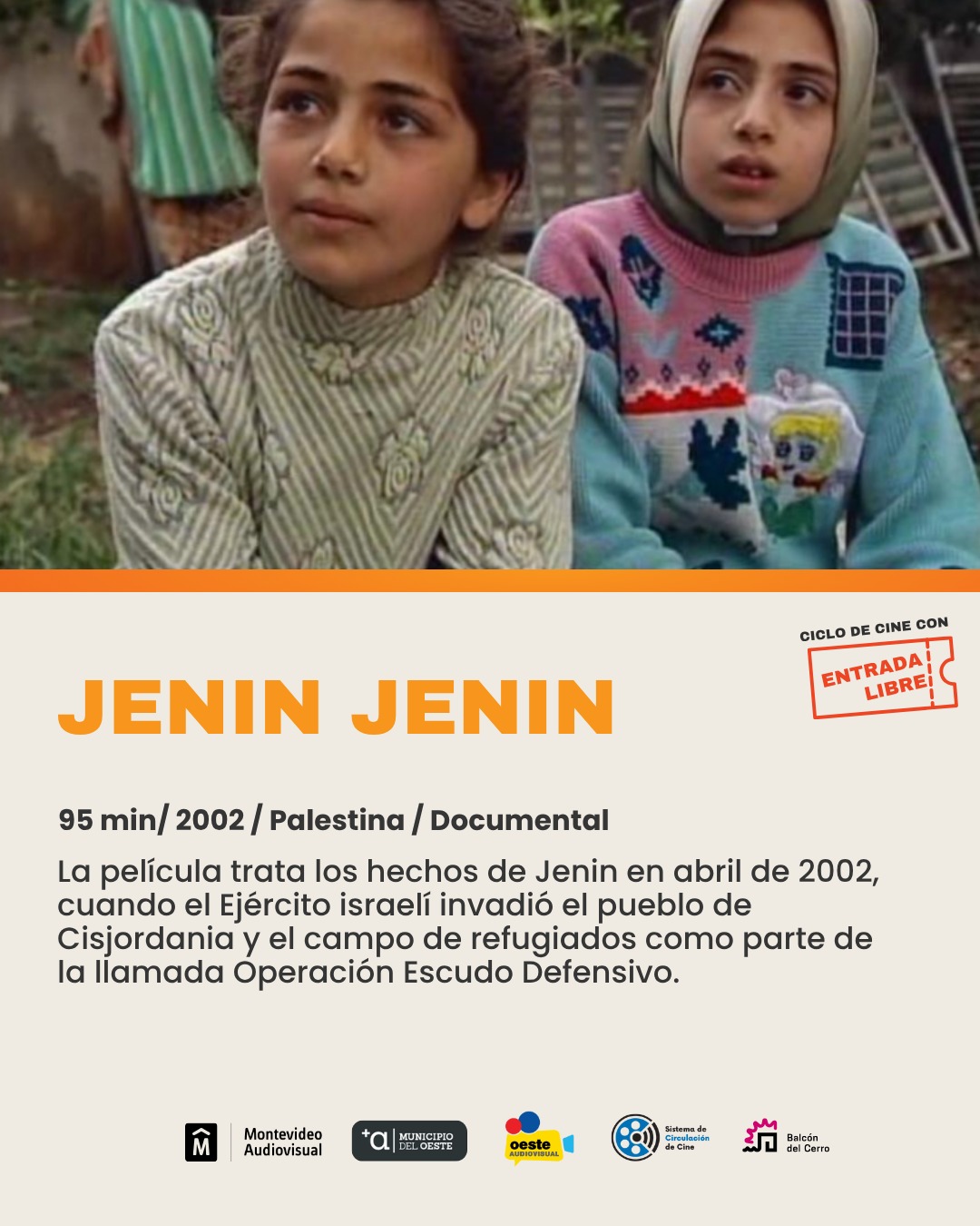 Se proyectará la película documental “Jenin Jenin” (95 min, 2002, Palestina), que aborda los hechos ocurridos en abril de 2002, cuando el ejército israelí invadió el pueblo de Jenin y su campo de refugiados en Cisjordania, en el marco de la llamada Operación Escudo Defensivo.